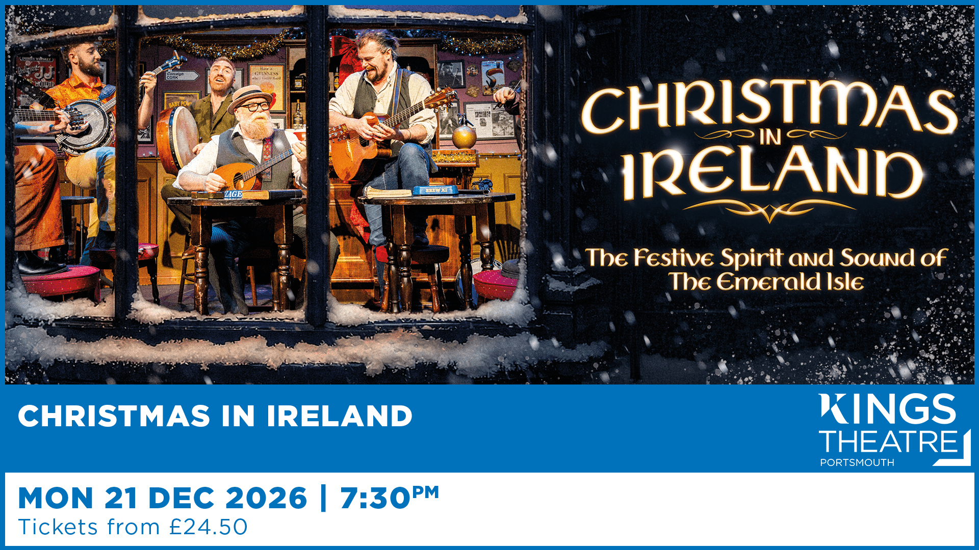 Be transported to a magical Christmas Eve inside a traditional Irish pub, where friends, old and new, gather to share songs, stories and memories of Christmases gone by. As snow falls outside, the air fills with heartwarming renditions of timeless Irish classics, powerful ballads and all your favourite Christmas songs. From the producers of Seven Drunken Nights and performed live by an outstanding cast of musicians and singers, the show features hits like, ‘Driving Home For Christmas’, ‘Dirty Old Town’ and, of course, ‘Fairytale Of New York’.