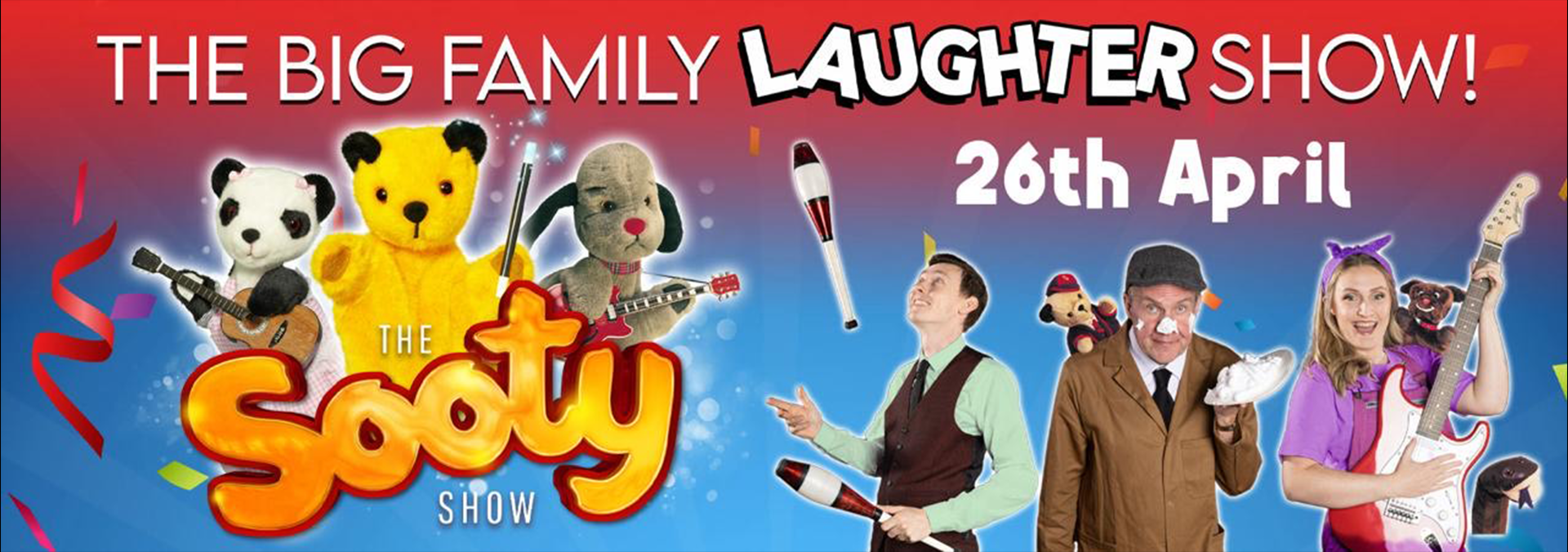 Sooty’s guests include favourites Butch, Ramsbottom and Scampi. Completing the crew will be amazing magician Russ Brown and Circus star Michael Jordan. Expect wonderful wizardry, Thrills and spills and of course lots and lots laughs! Watch out for Sooty’s supercharged water pistol!!